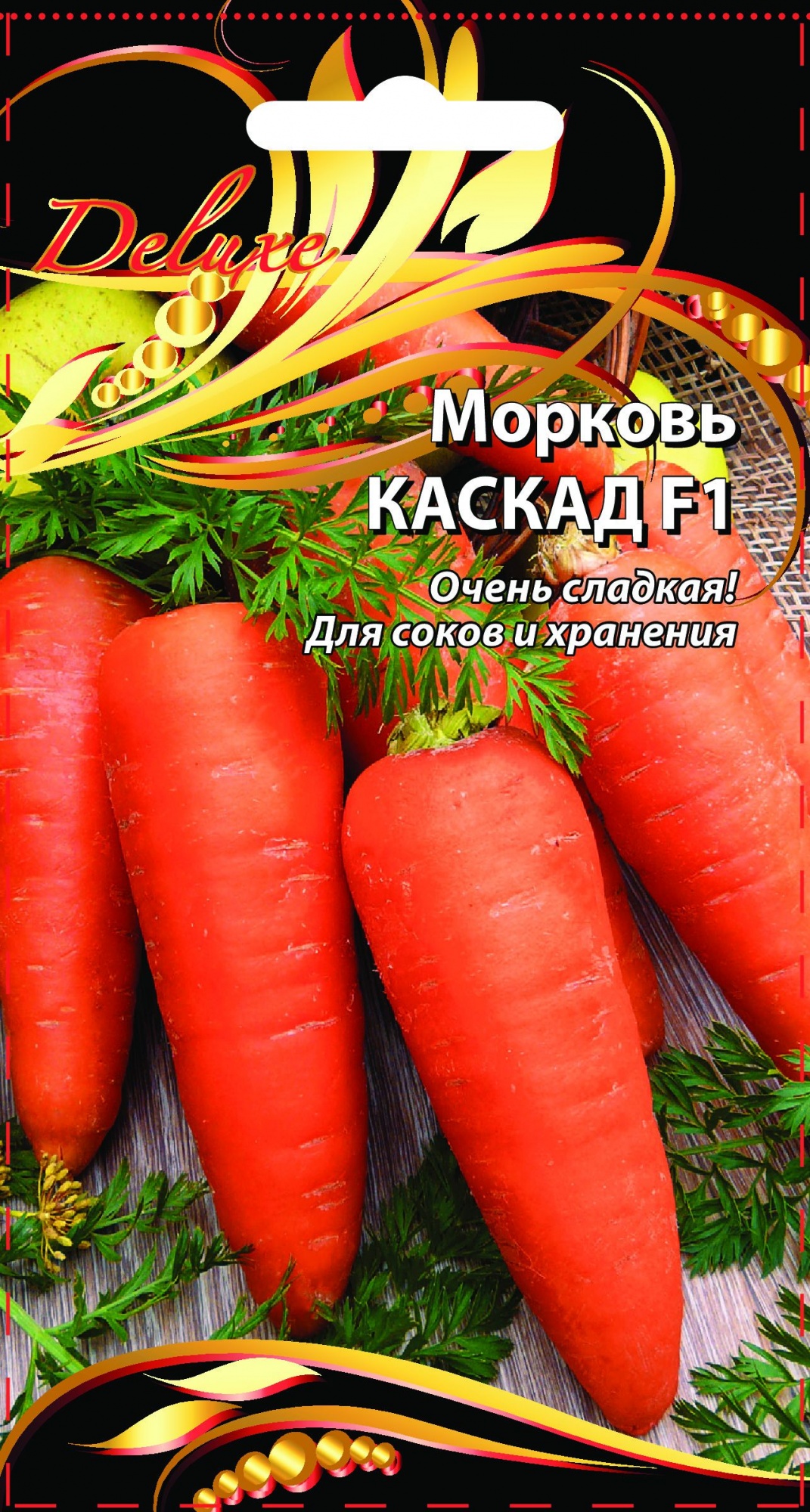 Среднеспелый (100-130 дней) гибрид универсального назначения. Корнеплоды конические с закругленным кончиком, ровные, без бугристостей, длиной до 22см, массой 50-80г. Мякоть оранжевая, нежная, сочная, очень сладкая. Ценность гибрида: высокая урожайность, выравненность корнеплодов, отличная лежкость, не растрескивается. Большое содержание каротина позволяет использовать корнеплоды для приготовления сока. Подходит для всех зон выращивания. Перед посадкой семена не замачивать, обработаны микроэлементами.