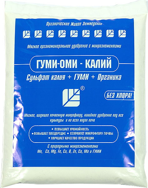 ГУМИ-ОМИ- КАЛИЙ - мягкое калийное сбалансированное по органическим, гумусным и минеральным веществам удобрение, универсальное для овощных и плодово-ягодных культур.